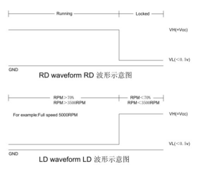 LD的功能是指:散熱風扇轉(zhuǎn)速低于設(shè)定的極限轉(zhuǎn)速時輸出高電平報警信號,如某規(guī)格的散熱風扇轉(zhuǎn)速標準為5000RPM;可設(shè)定70%以下的轉(zhuǎn)速時(即低于3500RPM)開始報警。(該極限轉(zhuǎn)速值可由客戶決定,一般默認為低于70%額定的轉(zhuǎn)速開始報警)。
